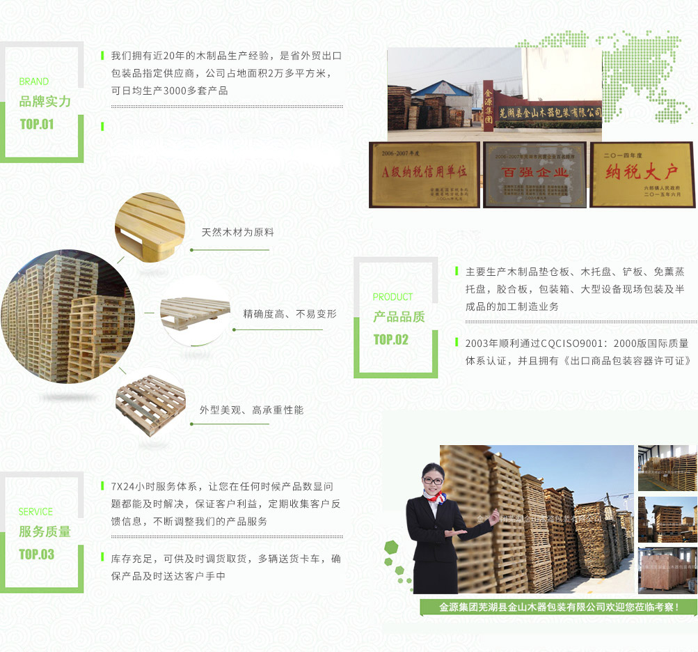 金源集團蕪湖金山木器包裝有限公司是省外貿(mào)出口包裝品指定的供應(yīng)商,主要生產(chǎn)木制品墊倉板、木托盤、鏟板、免薰蒸托盤,膠合板,包裝箱、大型設(shè)備現(xiàn)場包裝及半成品的加工制造業(yè)務(wù)。產(chǎn)品廣泛用于物流,倉儲,港口,碼頭,機械,建材,化工,紡織,食品,超市,五金電器等行業(yè)。公司占地面積2萬多平方米,注冊資金壹佰壹拾捌萬圓整,公司擁有員工160多人,其中技術(shù)人員占25%,可日均生產(chǎn)3000多套產(chǎn)品,年產(chǎn)值6000多萬元,公司下轄木材加工廠,組裝廠,并備有大型標準烘房,多功能平板刨,壓刨,挖槽,機械設(shè)備等。產(chǎn)品主要銷往國內(nèi)大中型城市并隨貨通行出口國外。